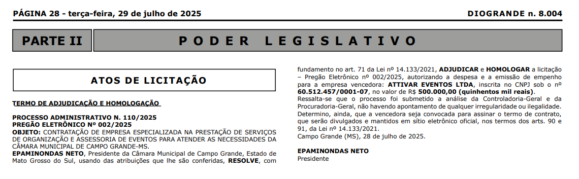 Foi publicado no Diário Oficial de Campo Grande (Diogrande) o resultado do pregão eletrônico nº 002/2025, no qual a empresa Attivar Eventos LTDA. foi declarada vencedora. inscrita no CNPJ sob o nº 60.512.457/0001-07, foi fundada em 23 de abril de 2025, há apenas três meses.