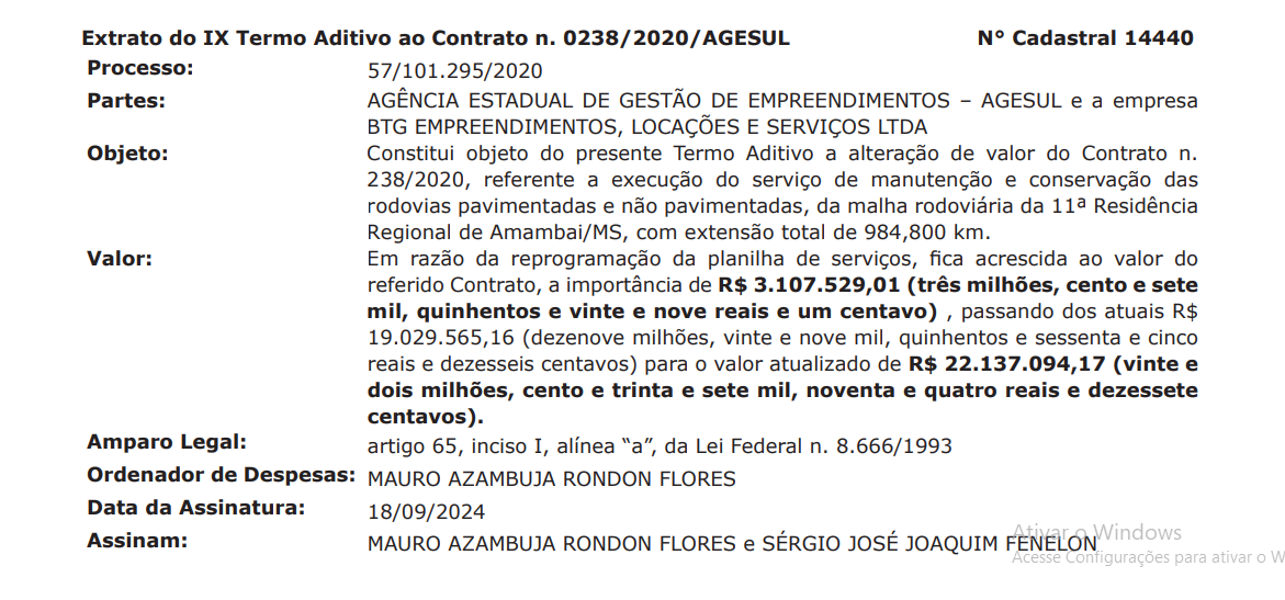 Com um aditivo contratual de R$ 3.107.529,01 milhões , a Agencia estadual de gestão de empreendimentos – AGESUL e a empresa BTG EMPREENDIMENTOS, LOCAÇÕES E SERVIÇOS LTDA publicarão o IX Termo Aditivo passando para o valor de R$ 22.137.094,17 (vinte e dois milhões, cento e trinta e sete mil, noventa e quatro reais e dezessete centavos).