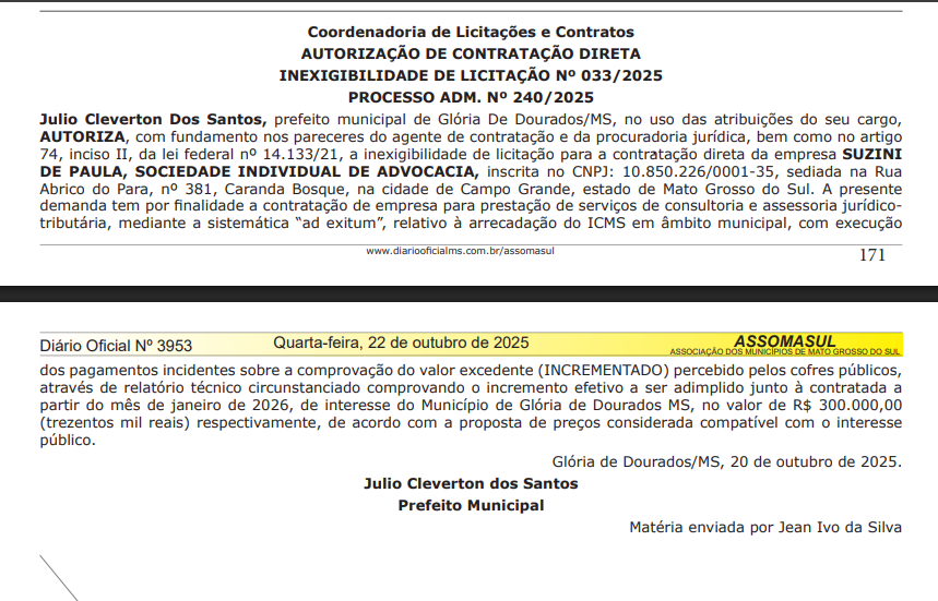 Em um momento em que os municípios enfrentam sérias dificuldades financeiras, a Prefeitura de Glória de Dourados tomou uma decisão no mínimo controversa: contratou, sem licitação, o escritório “Suzini de Paula, Sociedade Individual de Advocacia”, ao custo de R$ 300 mil dos cofres públicos.