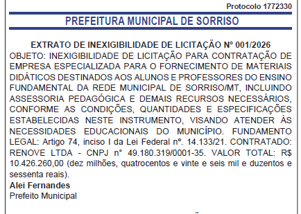 A Prefeitura Municipal de Sorriso, no norte de Mato Grosso, firmou um contrato no valor de R$ 10.426.260,00 (dez milhões, quatrocentos e vinte e seis mil e duzentos e sessenta reais) por meio de inexigibilidade de licitação para a aquisição de materiais didáticos destinados à rede municipal de ensino.