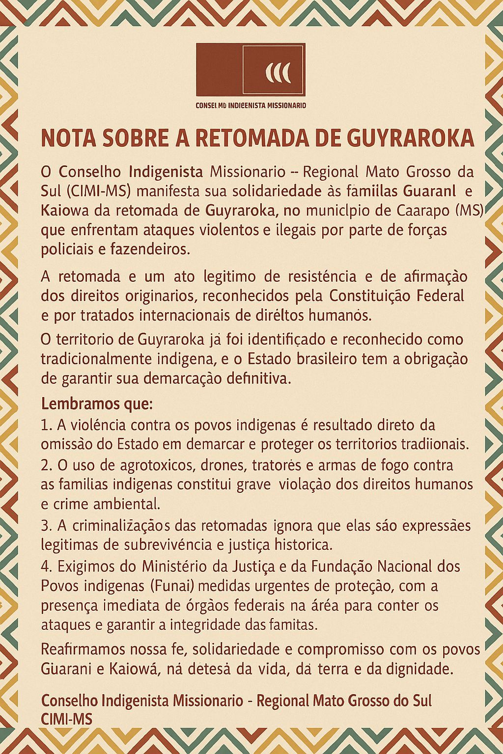 NOTA CIMI SOBRE A RETOMADA DE GUYRAROKA – 25/10/2025