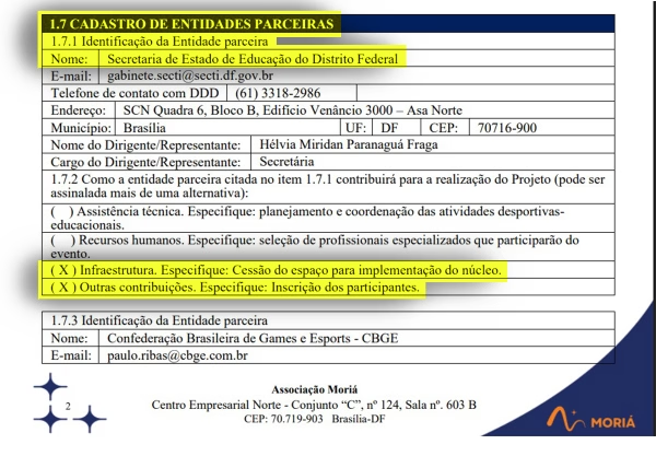 Para contar com as emendas da bancada do Distrito Federal para esse projeto, a entidade apresentou ao Ministério do Esporte um projeto técnico pedagógico que propunha a criação de 29 salas gamers em espaços cedidos pela Secretaria de Educação (SEEDF), mas a pasta nega ter aprovado qualquer proposta da ONG.