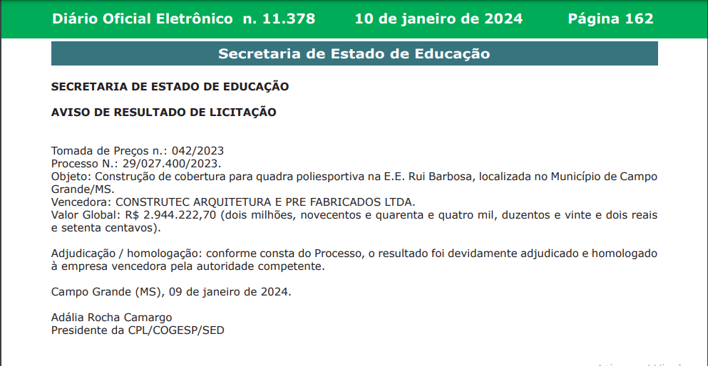 A Secretaria de Educação do Mato Grosso do Sul vai pagar quase 3 milhões com cobertura de quadra poliesportiva.
