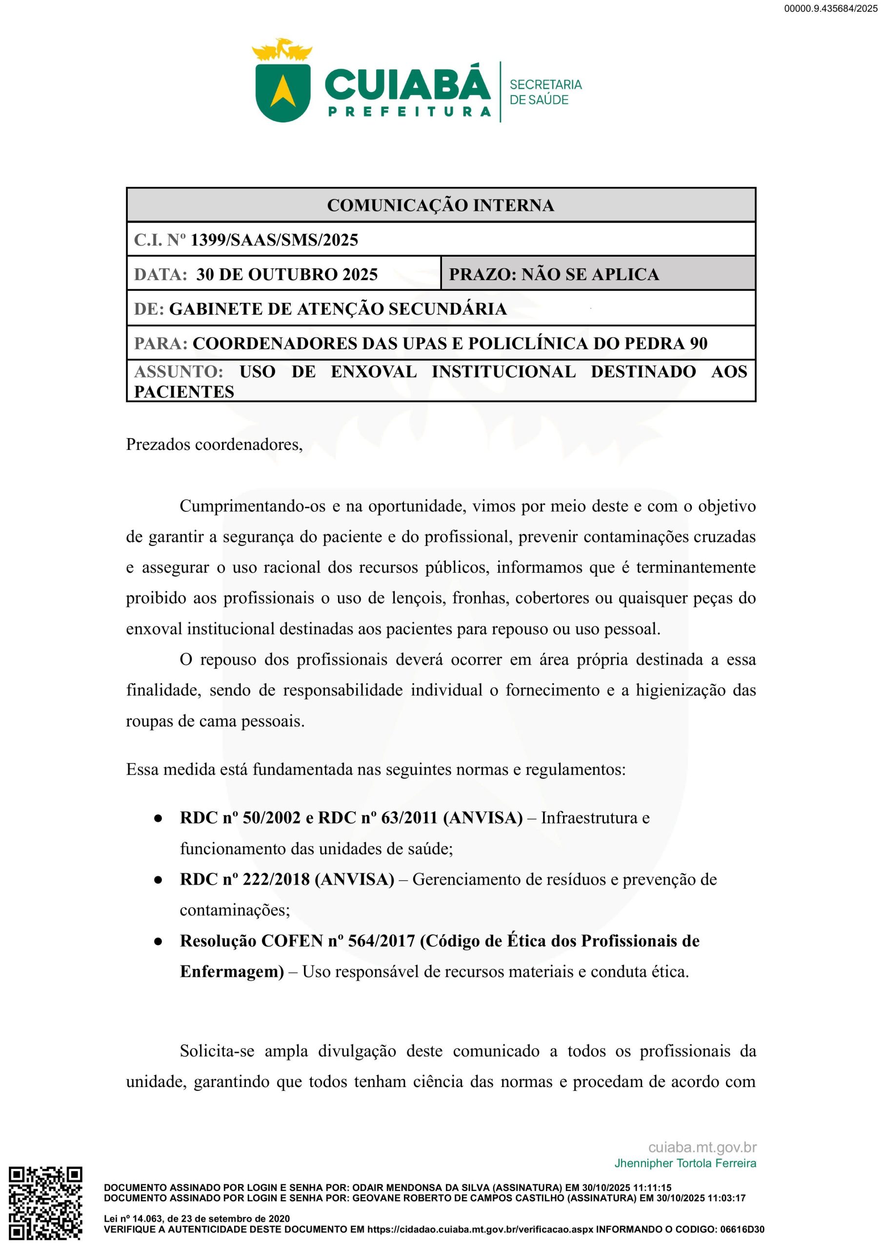 A decisão da gestão Abílio Brunini vem sendo considerada cruel e insensível por sindicatos e categorias da saúde. A justificativa da prefeitura é baseada em normas da Anvisa, mas, segundo especialistas, o argumento foi distorcido: a regra proíbe apenas o uso compartilhado de enxoval de pacientes, e não o fornecimento de roupas de cama específicas para os servidores.